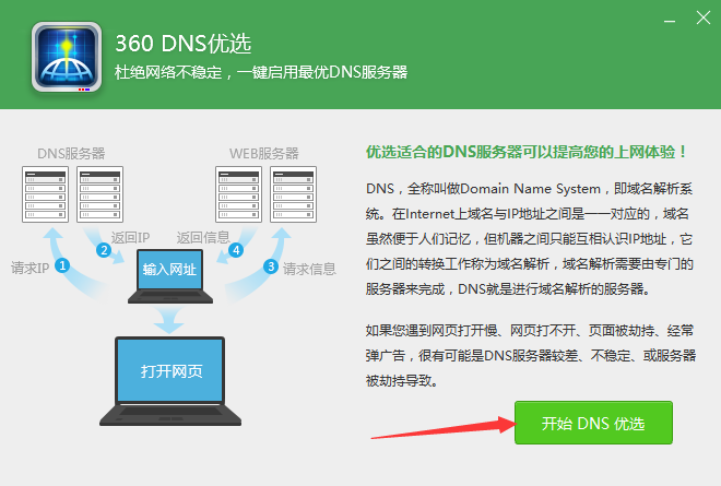 如您不放心,请使用方案②方案② – 使用「360DNS优选」,打开360卫士,根据以下图示操作: